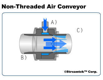 氣力輸送器采用壓縮空氣驅動,與標準管、軟管或鋼管相連,可 短 距離有效輸送各種類型的固體顆粒 物料。 使用調壓器調節壓縮空氣壓力,可有效控制物料輸送速度 ,可做為增壓補氣器使用。 工作原理: (A)壓縮空氣由一個標準NPTF進氣口A,流入并充滿整個環型氣室。 (B)壓縮空氣通過喉口處噴嘴C以高速噴出,在負壓端B產生高真空。 (C)負壓吸入物料并加速通過氣力輸送器,可以輸送相當長的水平或垂直距離。